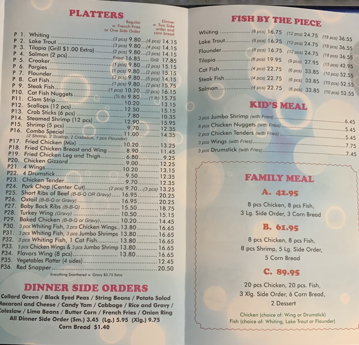 “ Everything is always good here. The vibe, the staff and even the people waiting sit patiently knowing what they came for. My favs include the thick homestyle macaroni and cheese, the collard greens, steak fish, fried catfish and fried flounder. My favorite appetizer includes their crab sticks they are seasoned to perfection and fried hard enough to crunch but not hot enough to burn my mouth. I really appreciate the small extra miles the staff goes to ensure you return. Ask them to punch a hole in your giant half and half, they have scissors waiting at your request. Ask they to punch holes in your containers to prevent sogginess, they consider the request without a second thought. I’ve been coming here since I was a child, I’m 25 now and no longer live in the area. But whenever I can, I definitely don’t hesitate to grab a plate! This was one of my birthday plates. ”